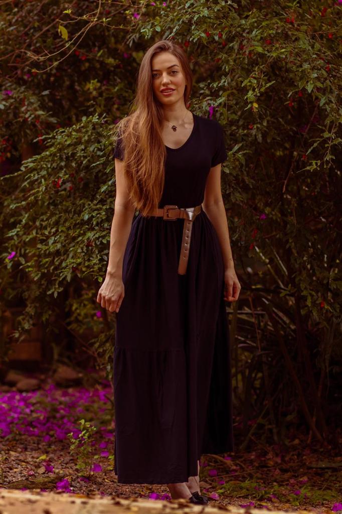 Vestido longo em viscolycra lisa com recortes 3 marias na saia.